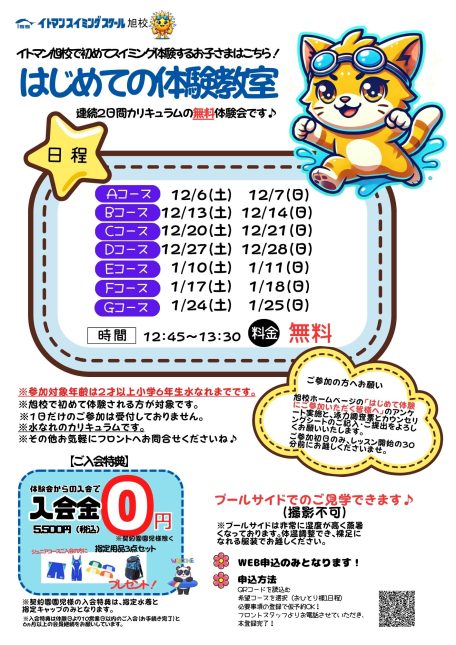 イトマンスイミングスクール旭校は2026年1月よりシステム変更を実施し、現在の「水なれコース」がなくなります。年内までにご入会手続きいただくと、来年以降も既定の級に進級されるまで月会費が『水なれコースの料金』✨でお通いいただけます。ぜひこの機会に体験レッスンをご受講いただき、年内のご入会をお願いいたします!