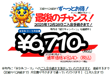 来年2026年1月より低価格帯の「水なれコース」が廃止となります。年内に「水なれコース」にご入会手続きいただくと、ジュニアコースに進級されるまで月会費がそのまま!になります!初めての習い事にスイミングをお考えの方・既存会員様の弟妹のご入会をご検討されている方、今です!今ご入会ください!年内ご入会手続きの方まで「水なれコース」選択していただけますよ~!