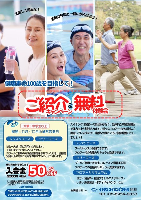 イトマンスイミングスクール旭校では大人の皆様に運動を始めていただきやすい、様々なカリキュラムをご用意しております。是非一度無料体験を受けてみてください!前日までにご予約をお願いいたします。