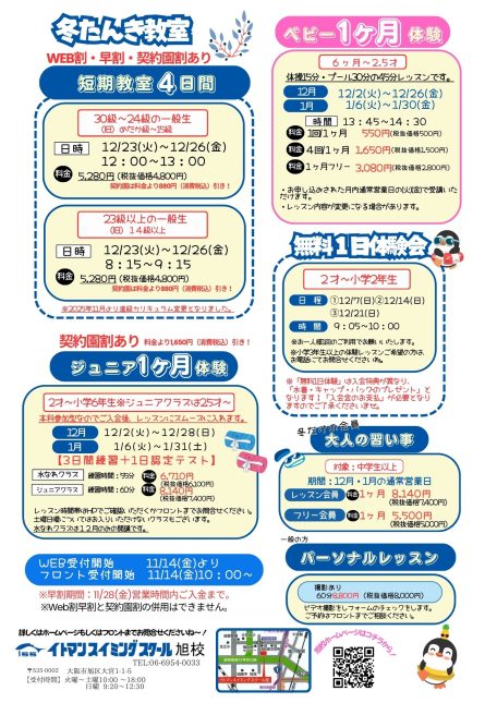 イトマンスイミングスクール旭校は2026年1月よりシステム変更を実施し、現在の「水なれコース」がなくなります。年内までにご入会手続きいただくと、来年以降も既定の級に進級されるまで月会費が『水なれコースの料金』✨でお通いいただけます。ぜひこの機会に体験レッスンをご受講いただき、年内のご入会をお願いいたします!