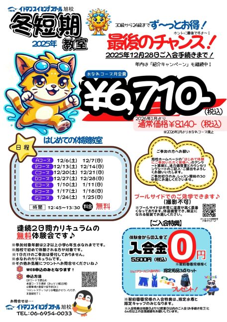 イトマンスイミングスクール旭校では2026年1月よりシステム変更をし、月会費も変更となります。そこで!年内にご入会手続きを終了されましたら、進級するまで(30級~24級まで)月会費の変更なく通っていただけます!✨ぜひこの機会にご入会をご検討くださいませ!