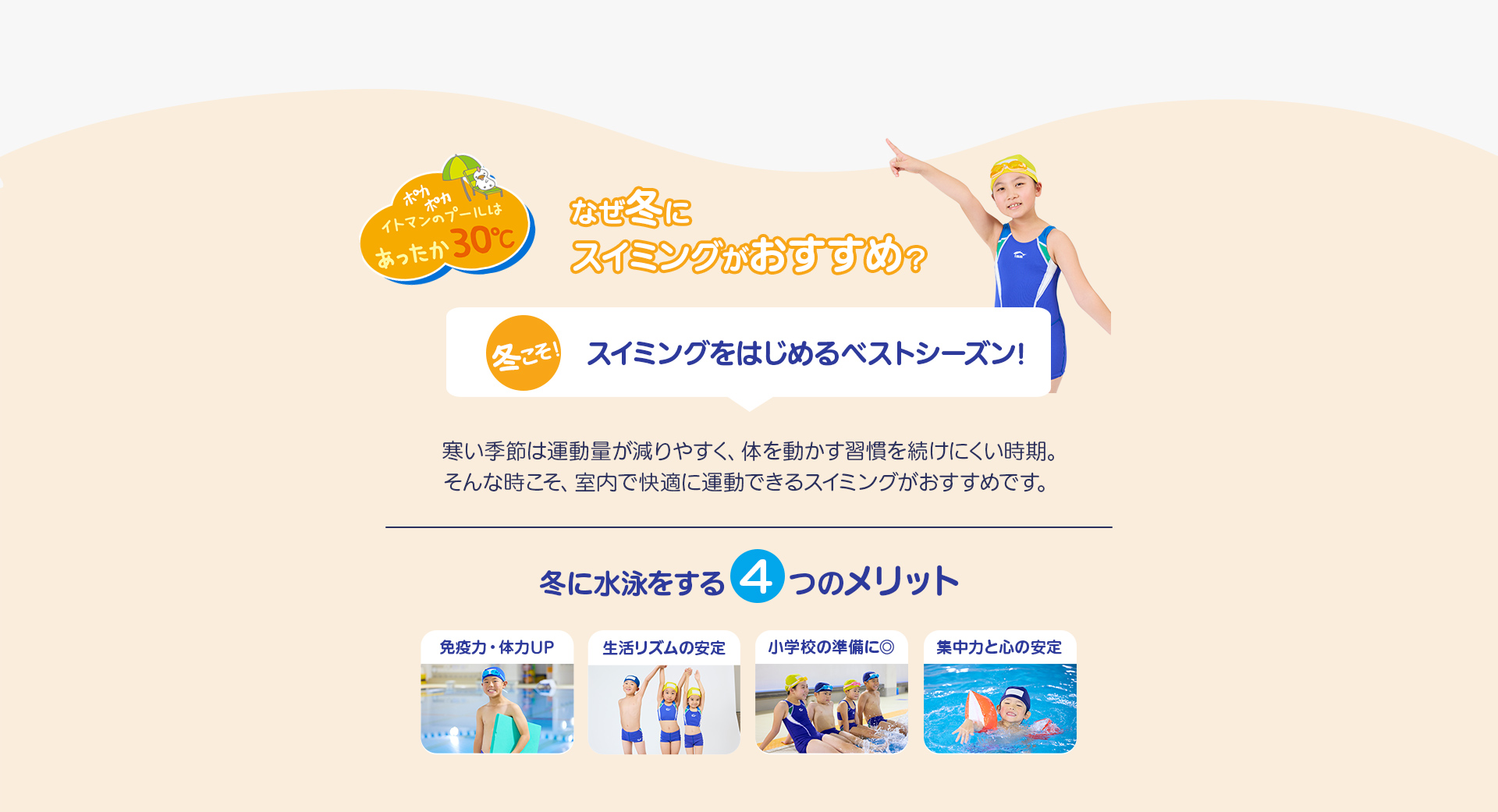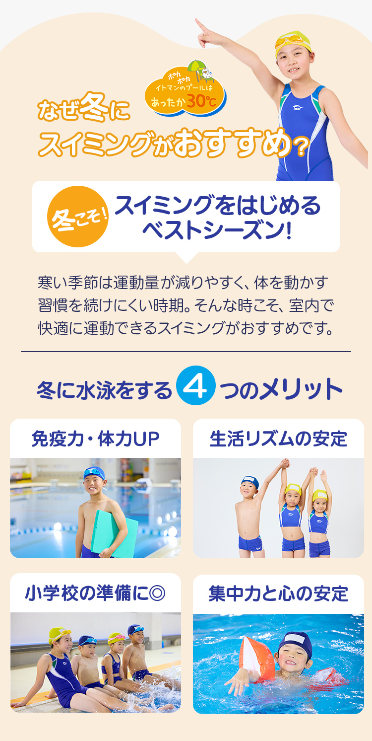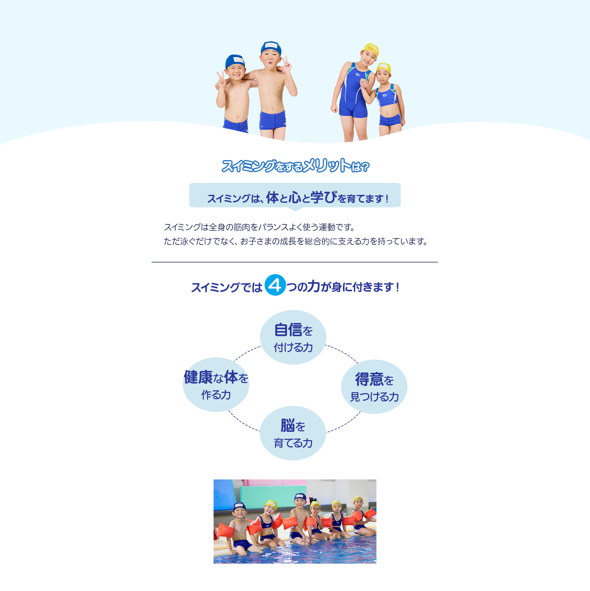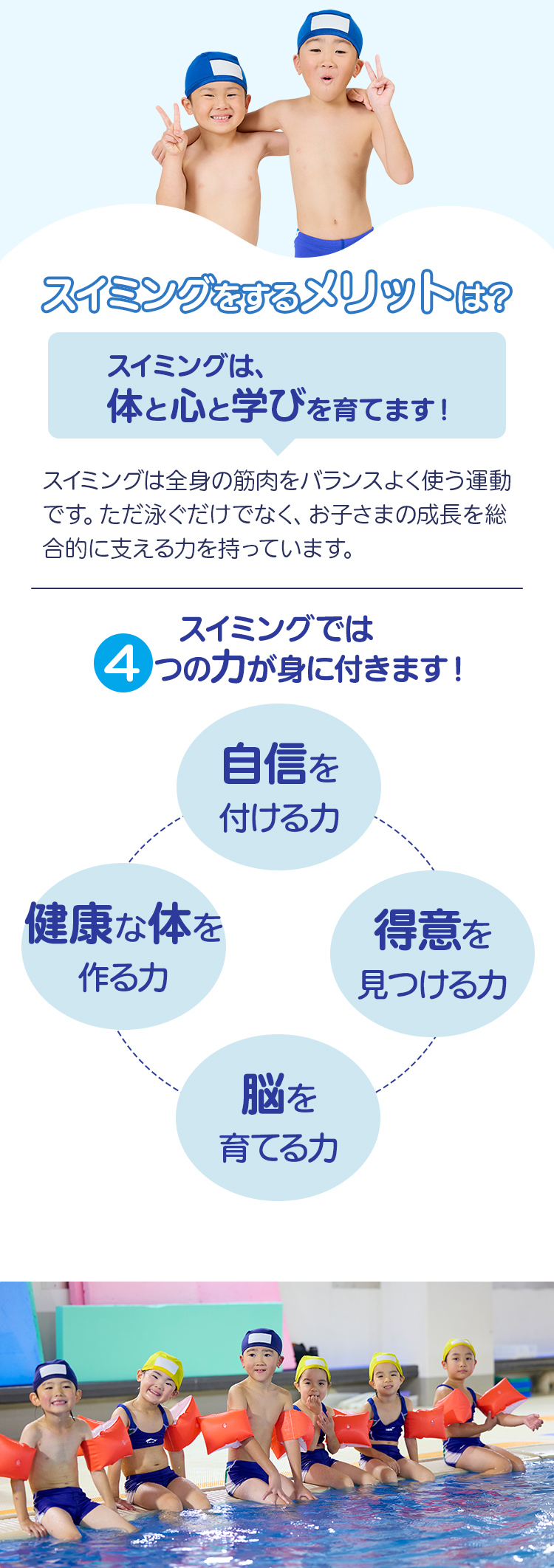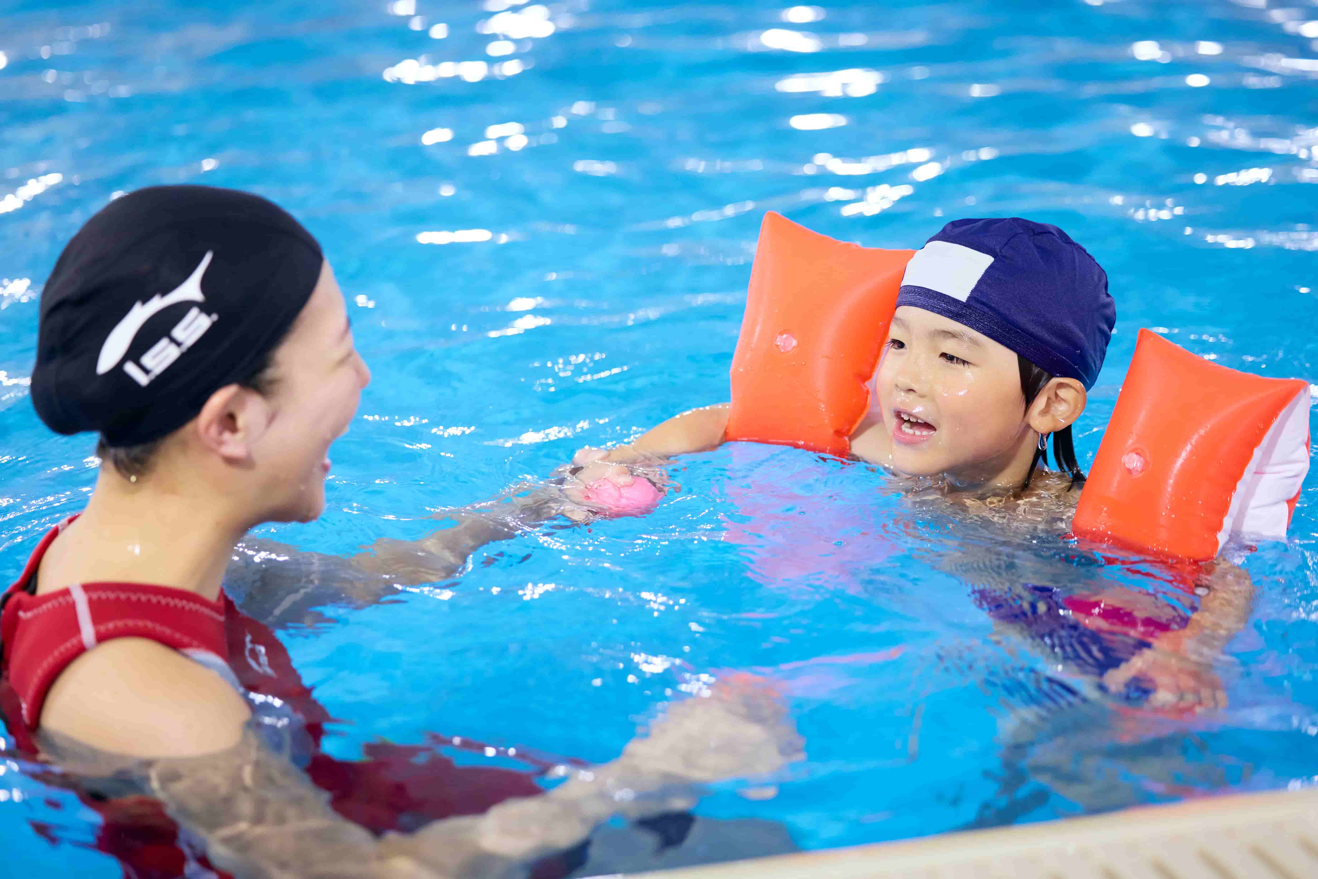 プールがはじめてのお子さまからクロール習得レベルまで、クラス分けで、一人ひとりにぴったりなクラスで体験できます。スモールステップのカリキュラムで自信を育みます。