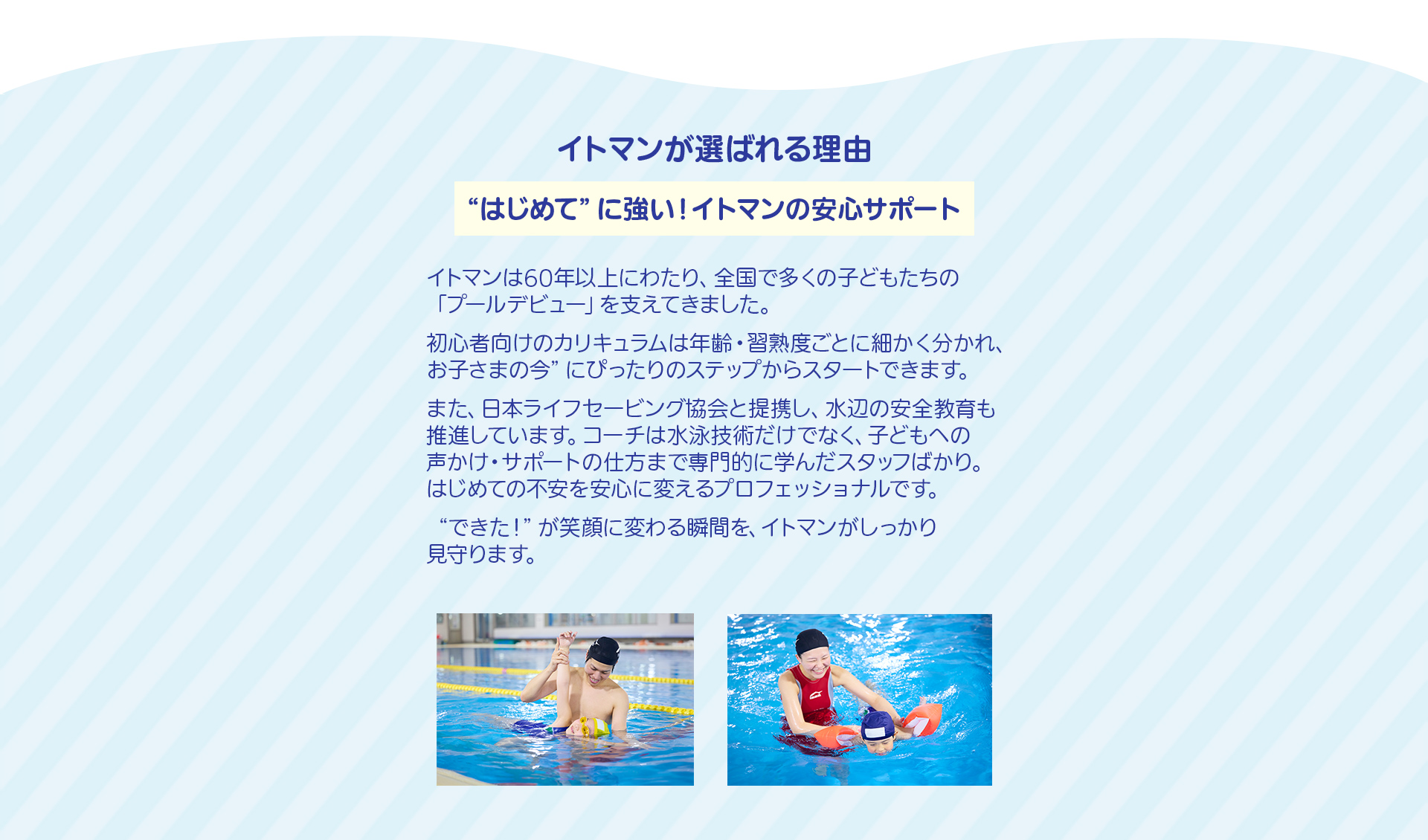 A. 基本的には同じコーチが担当いたします。しかし1日目の授業を行って次の級までの泳力があると確認しました場合、2日目から級を移動することがございます。その際は担当コーチを変更する場合がございますが、お子様に適正な授業を受けていただくためのものですのでご理解ください。