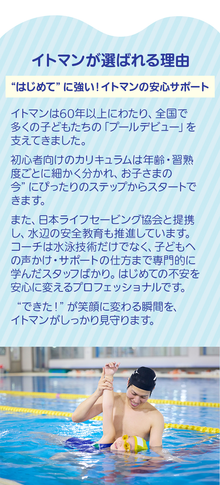 A. はじめての環境が怖いと思うお子さまはたくさんいます。周りのお子さまもまだまだ水が怖いというお友達ばかりです。不安に思われるのであれば、しっかり近くにつき安心できるようにしますし、お子さまの様子を見ながら「やりたい」を引き出し、少しずつ慣れるようにしていきますので安心してお任せ下さい。