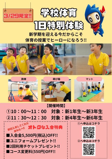 進級・進学前最後の体験となります。この体験で「できた!」と成功体験を積んでいただき、今後の体育でヒーローになりませんか?