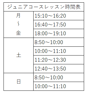 時間:ジュニアコース時間帯(詳しくは下記ジュニアコースレッスン時間表をご覧ください)