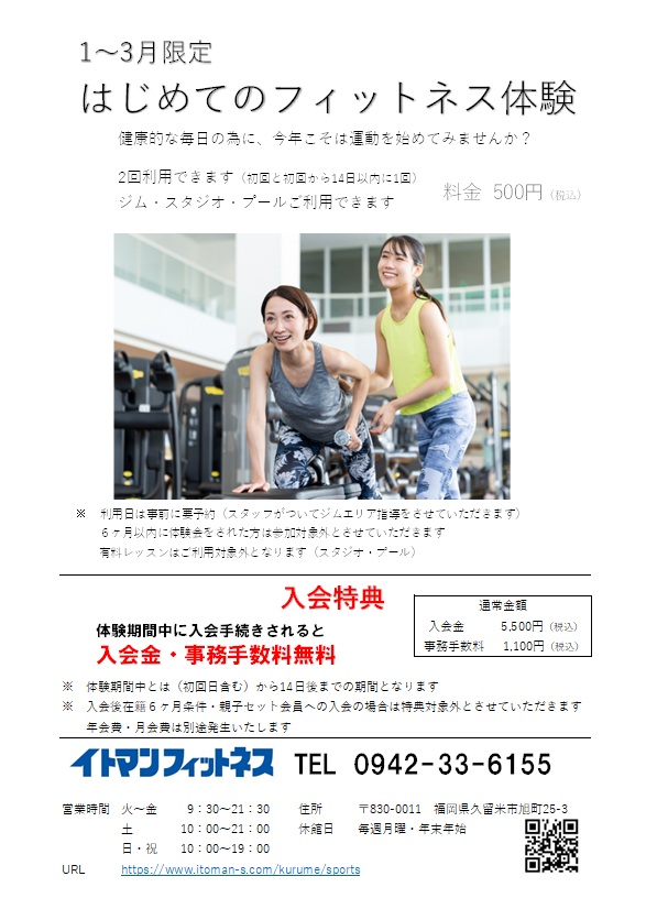 現在、イトマンフィットネスでは3月までの期間限定で「はじめてのフィットネス体験」を開催中です。