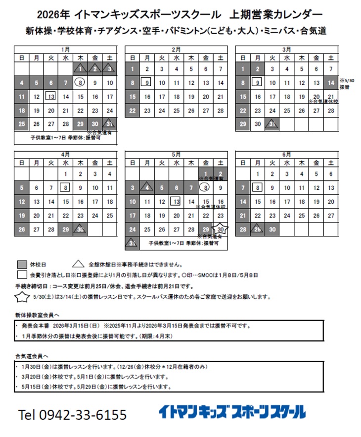 2026年上期(2626.01~2026.06)レッスンカレンダー