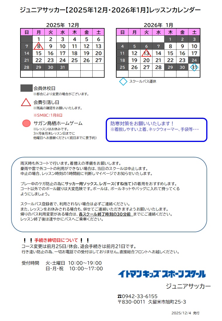 2025年12月~2026年1月 ジュニアサッカー カレンダー
