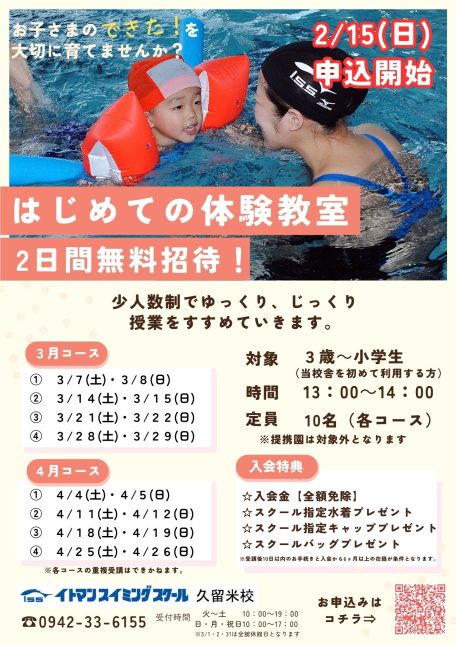 イトマンスイミングスクール久留米校からお得な体験のお知らせです😄