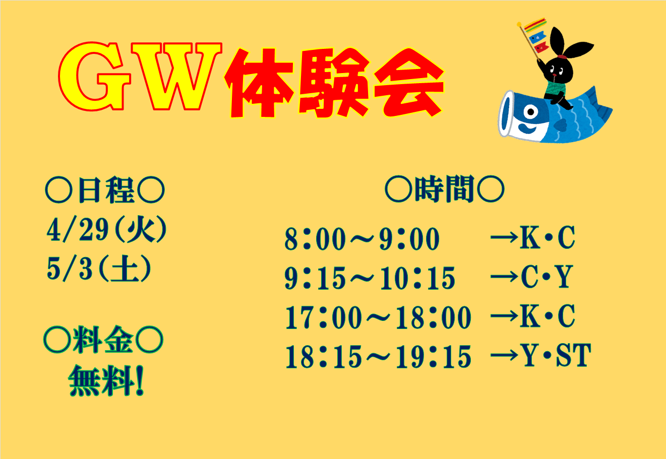 今日はGW(4/29と5/3)に実施する体験会のお知らせです!