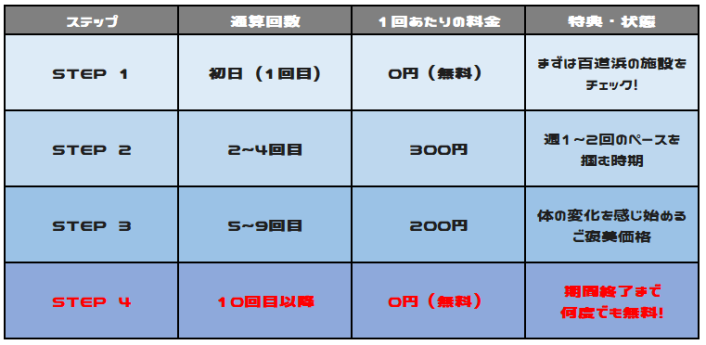 10回目以降は、期間終了まで何度通ってもタダ。