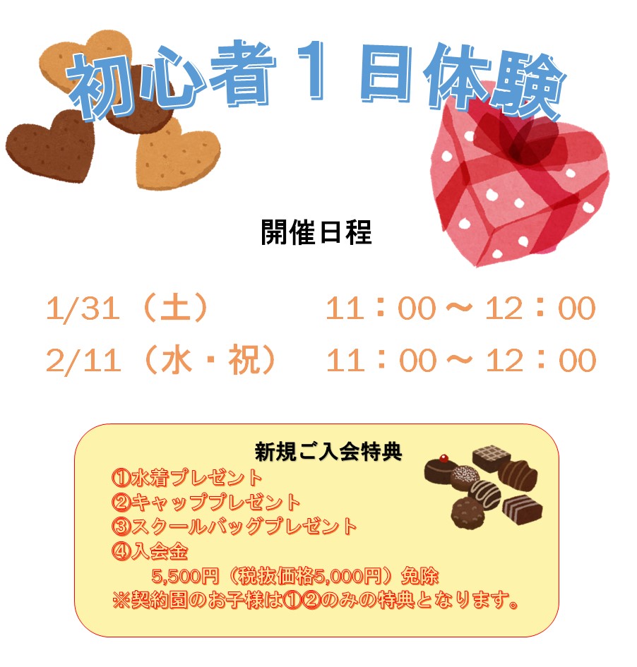 体験会当日は、水着・水泳キャップ・タオル・ビニール袋(タオルを入れる)・ゴーグル(必要な方)をお持ちください。
