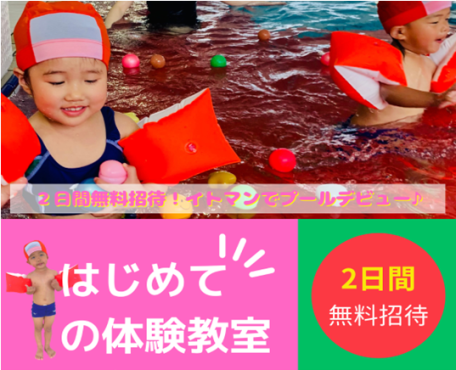 対象は、イトマンスイミングスクール・当校舎をはじめて利用される方(3歳~小学生)限定で、水慣れからクロールまでを対象とした特別体験教室となります🎵