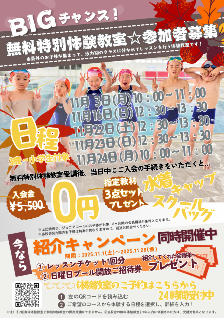 11月は下記日程5日間限定で、無料特別体験教室を開催します!