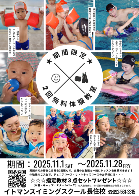 イトマンスイミングスクール長住校では、11月限定の無料体験教室を開催致します🎵