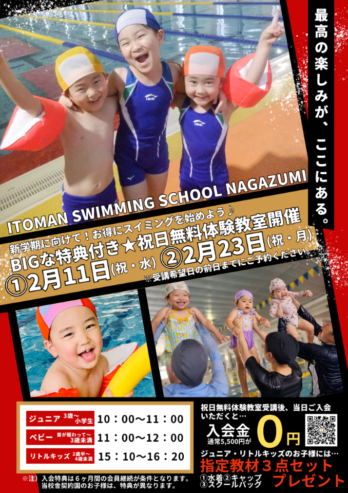 イトマンスイミングスクール長住校では、2月の祝日に無料体験教室を開催します🚩