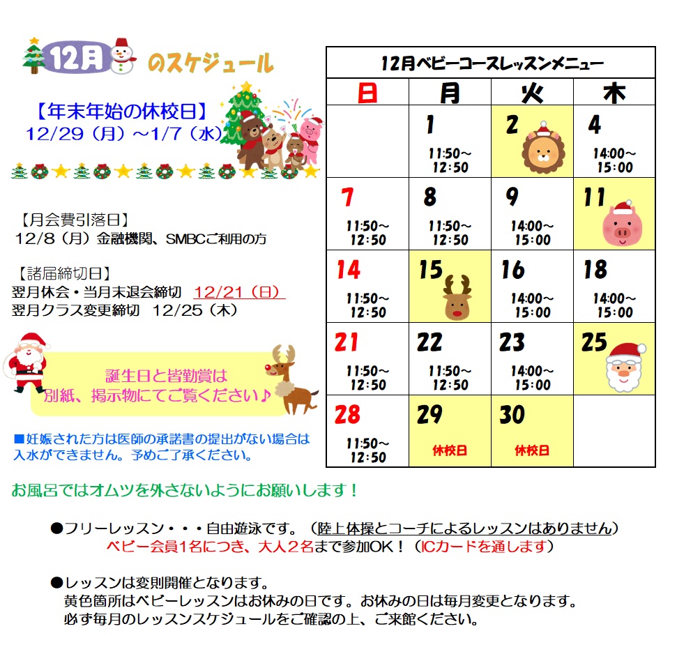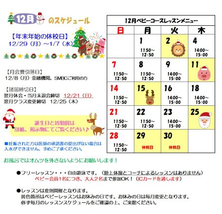 12月のベビースイミングのレッスンスケジュールをお知らせします。