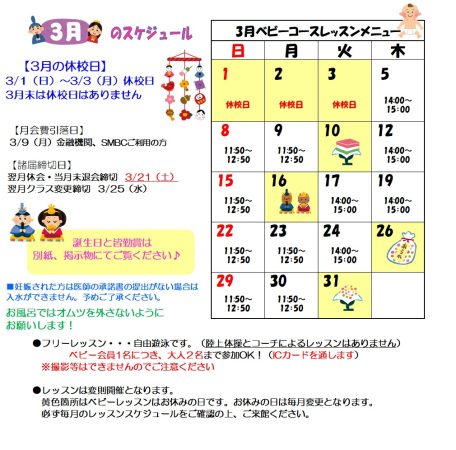 3月のベビースイミングのレッスンスケジュールをお知らせします。