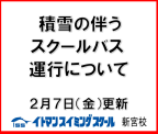 平素はイトマンスイミングスクール新宮校をご愛顧いただき、誠に有難うございます。 《積雪時のスクール対応について》 現在積雪予報が出ている期間があり、積雪時の施設運営につきましては、原則として通常営業い...