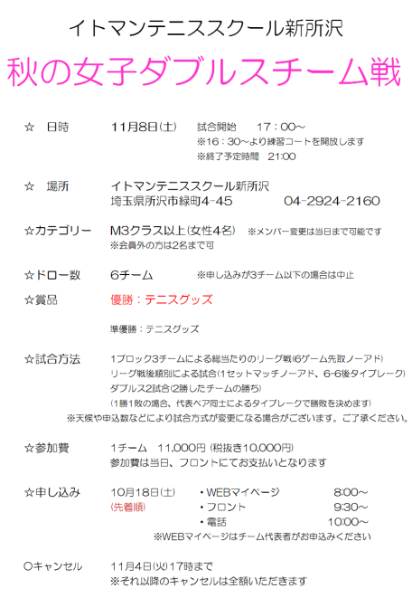 11/8(土)休講日の17:00~「秋の女子ダブルスチーム戦」を開催いたします。