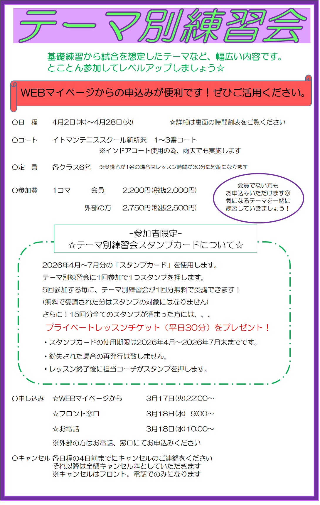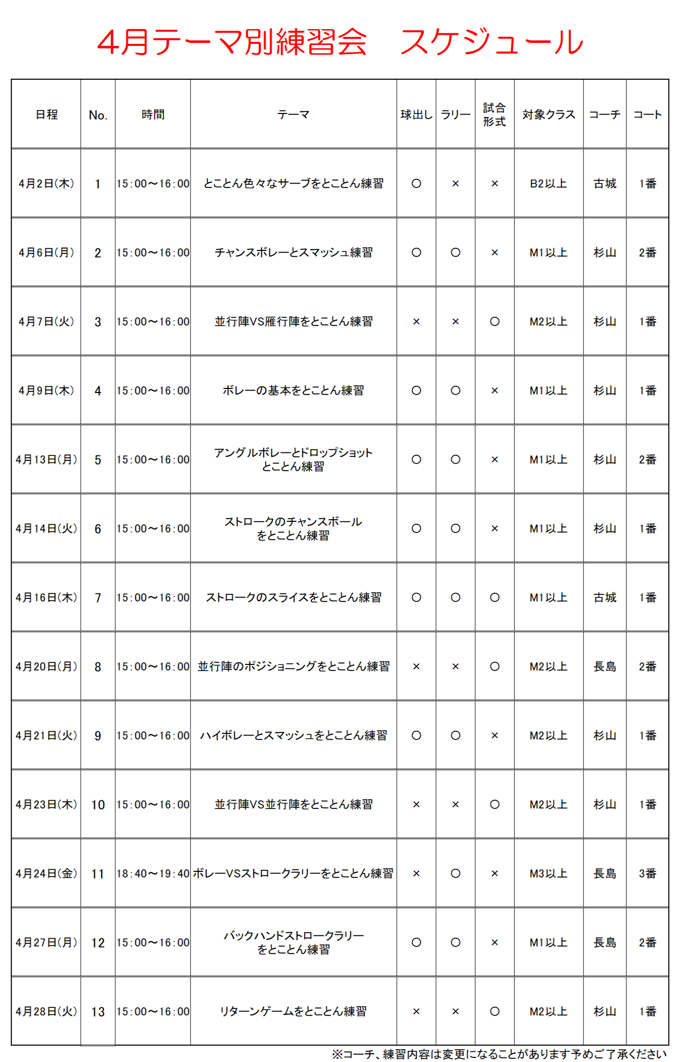 新しい環境とともに、テニスでも新しい成長を一緒に目指していきましょう。