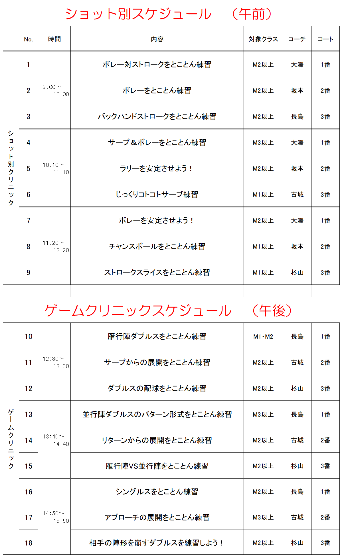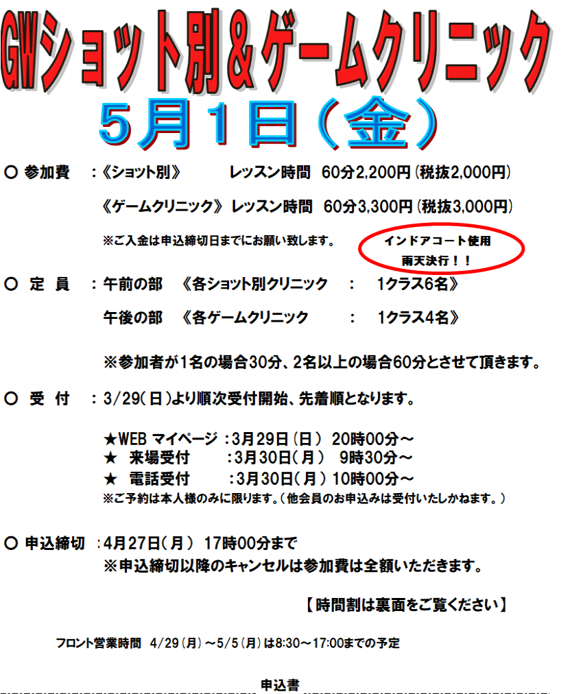 午前は苦手克服に最適なショット別レッスン、午後は実戦形式で学べるゲームクリニックです。