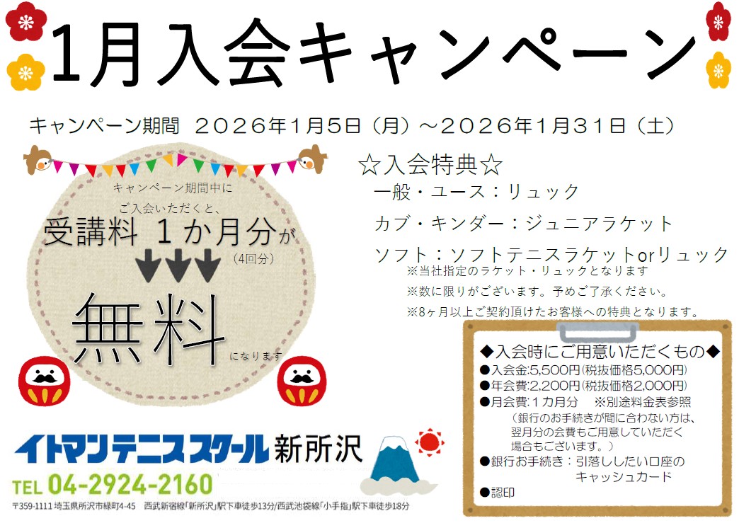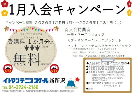 イトマンテニススクール新所沢では、1/5(月)~1/31(土)の期間でとてもお得な入会キャンペーンを行っております!