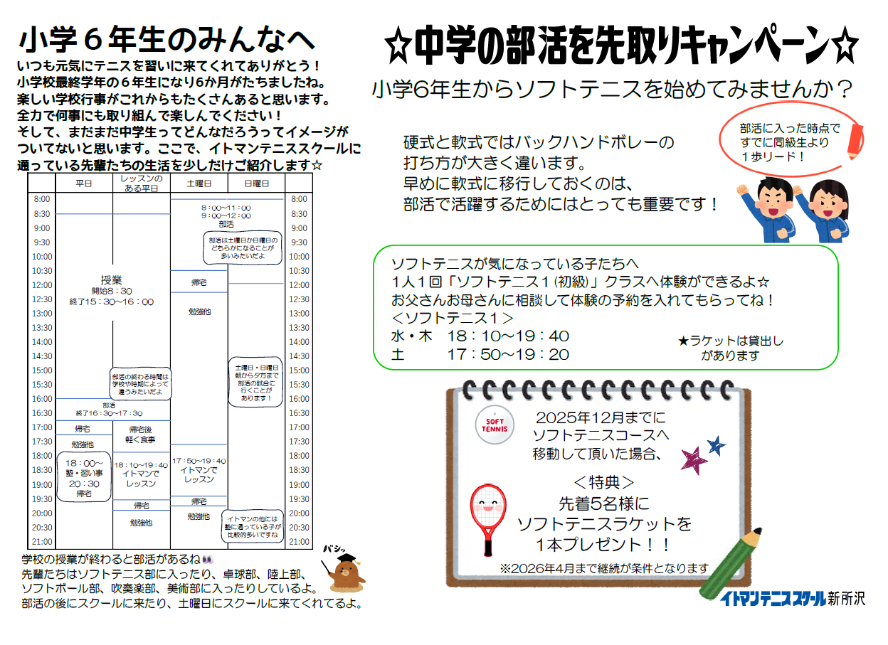 本日は、現在会員の小学6年生へ向けた☆中学の部活を先取りキャンペーン☆のお知らせです。
